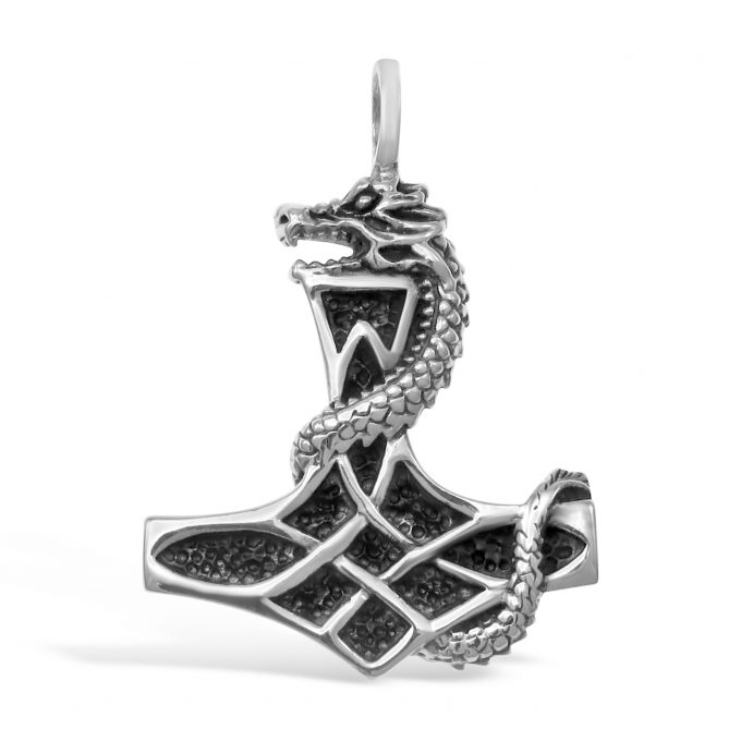 The Midgard serpent wraps itself around Thor’s Hammer “Mjolnir” This powerful amulet invokes the strength of Thor and the dragon.